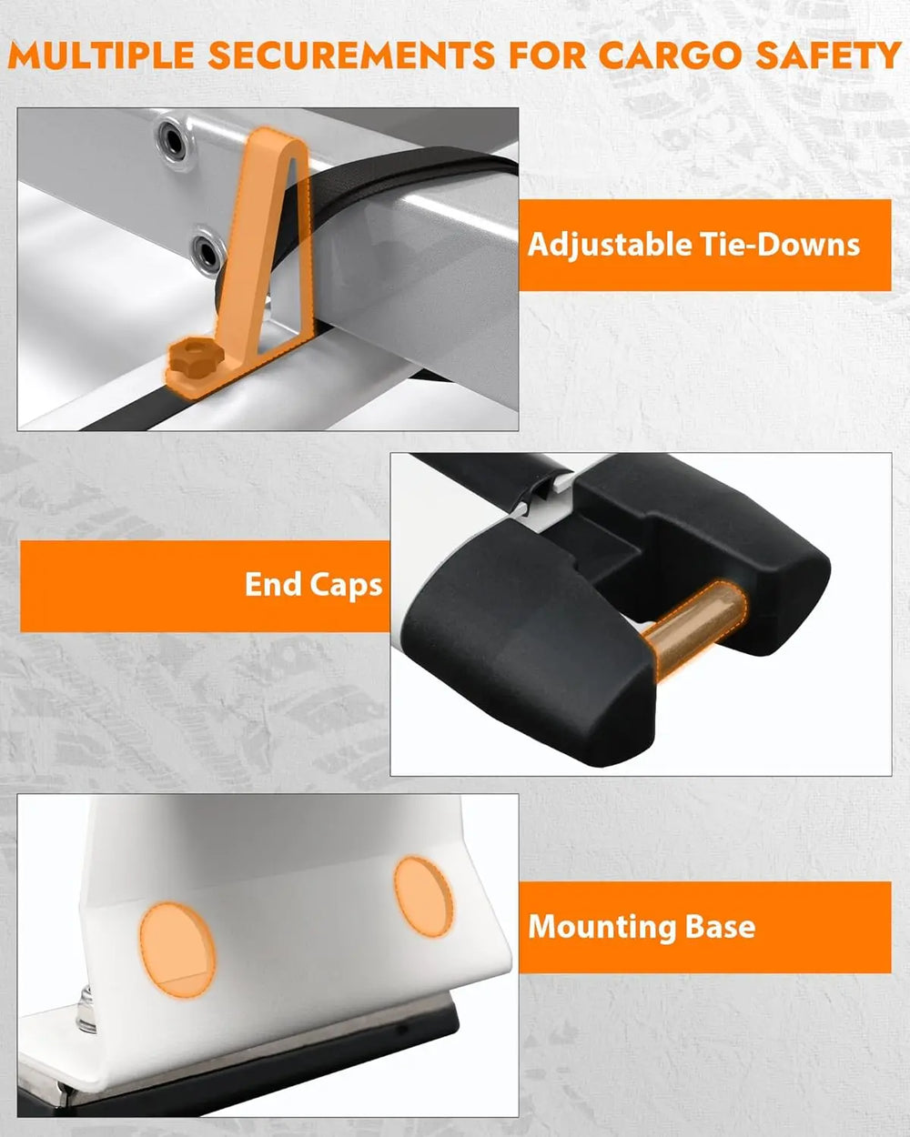 - STABLE & SECURE: End cap, adjustable tie-downs and holes on mounting base of van racks provide different fixation points, can fasten items firmly to ensure safety and stability while transportation