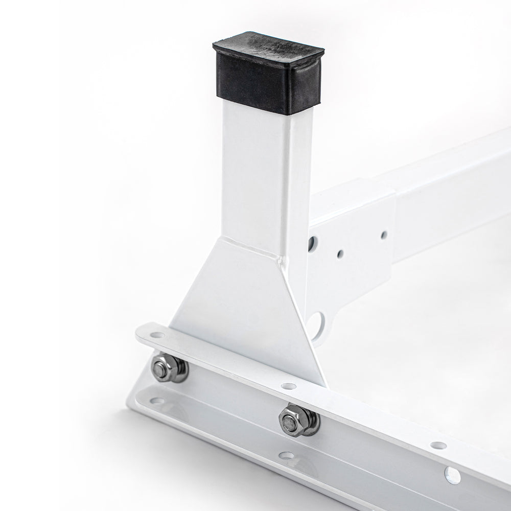 An extra-wide 8" base welded to the uprights provides a full seal with the roof. Rubber end caps and ladder stoppers reduce wind noise and vibration while keeping water out.