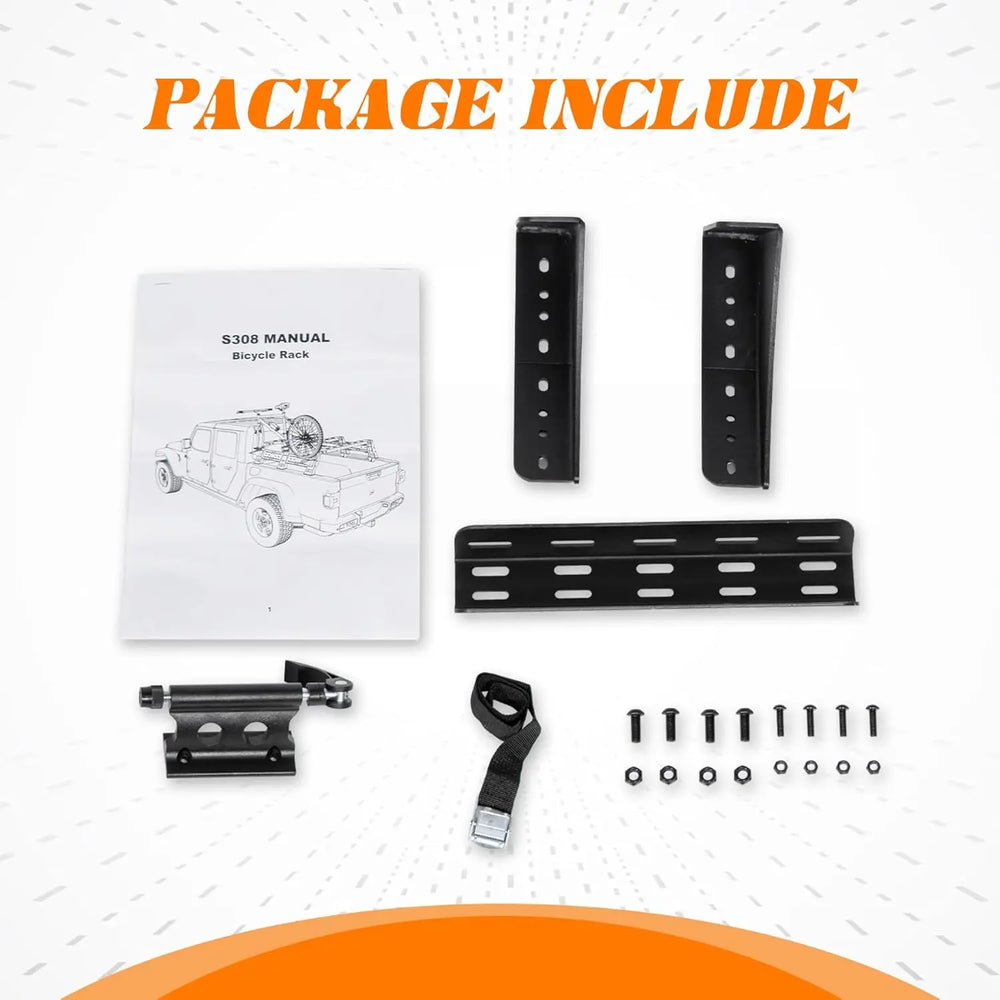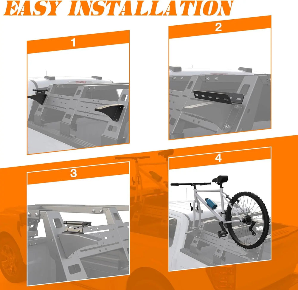 • WIDE APPLICATION: Truck bed bike rack is compatible with full-size pickup trucks, such as Ford F150, 250,350, Dodge Ram, Chevy Silverado, GMC Sierra, etc, as long as your truck bed has an overland bed rack. Attention, our bike rack uses M8 bolts to install to the bed rack.