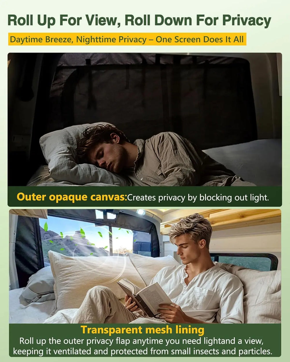 Versatile Use: Privacy screen can be rolled up for outdoor visibility while keeping your van bug-free; bottom section can be rolled up halfway for easy access to garage items. Includes nylon straps and carabiners for secure fastening.